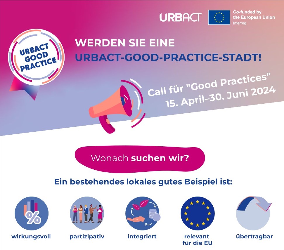 Kennen Sie eine Stadt oder Gemeinde, die erfolgreich eine Maßnahme im Bereich nachhaltige Stadtentwicklung umgesetzt hat? Dann machen Sie die Personen auf den URBACT Good Practices Call aufmerksam! EU-relevante, übertragbare Stadtentwicklungs-Maßnahmen werden mit dem Good-Practice-Label gekürt. Städte und Gemeinden mit dieser Auszeichnung erhalten durch eine Reihe von Kommunikationsaktivitäten Sichtbarkeit auf EU- und nationaler Ebene. Außerdem werden alle URBACT-Good-Practice-Städte auf dem URBACT-City-Festival vom 8.-10. April 2025 in Breslau in Polen präsentiert. Bewerbungen sind bis 30. Juni 2024 möglich.