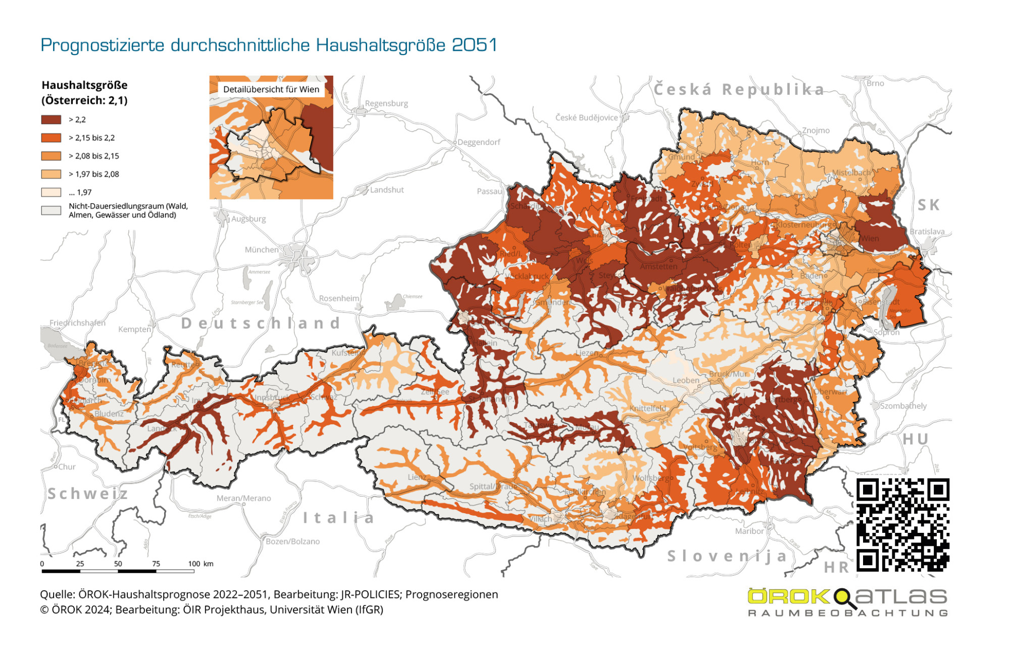Im Auftrag der ÖROK und begleitet von der Arbeitsgruppe Prognosen wurde von der JOANNEUM RESEARCH Forschungsgesellschaft mbH eine regionalisierte Haushaltsprognose für Österreich mit dem Zeithorizont 2051 erstellt. Basis ist die ÖROK-Bevölkerungsprognose 2021. Die Hauptvariante berücksichtigt dabei nicht nur die demografischen Entwicklungen, sondern auch verschiedene gesellschaftliche Trends, wie zum Beispiel die spätere Haushaltsgründung aufgrund längerer Ausbildungszeiten.