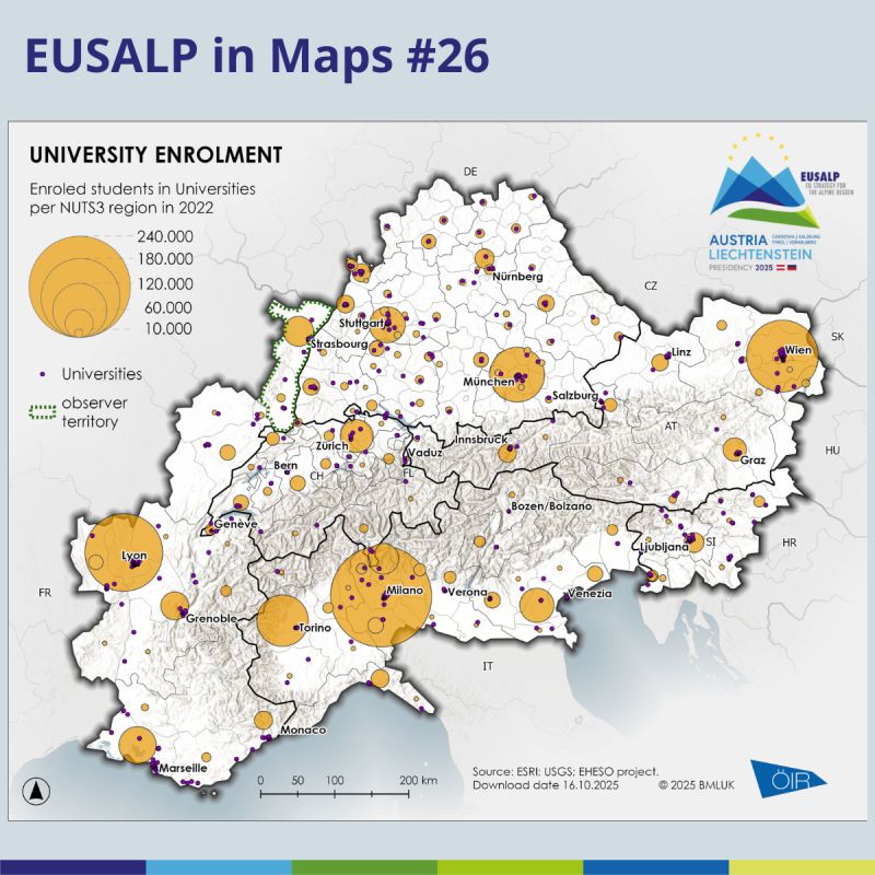 #26 „University Enrolment“ zeigt, wo sich Studierende im Alpenraum konzentrieren – und wo Lücken im Zugang zu Hochschulbildung bestehen. Forschungseinrichtungen sind dabei zentrale Bestandteile regionaler Innovationsökosysteme.