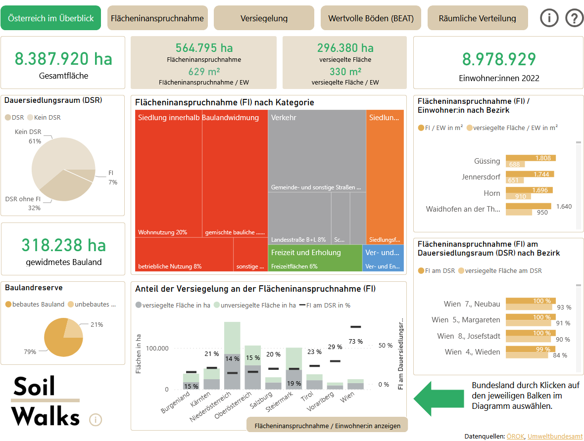 Die Daten des ÖROK-Monitorings mit Ergebnissen für alle Gemeinden (Referenzjahr 2022) wurden für das Forschungsprojekt „Soil Walks“ -Programms jetzt in einem interaktiven Dashboard aufbereitet und auf dashboard.soilwalks.at veröffentlicht.